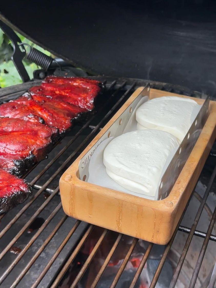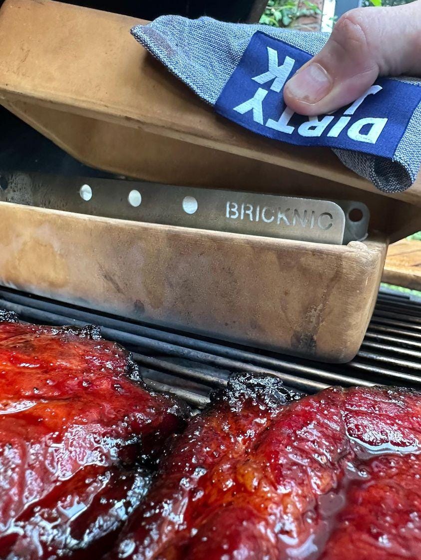 Place your Bricknic Cooking Brick with the Airmail Steaming inlet right next to the Char Siu inside the Kamado grill. They're going to become best buddies in this flavorful journey. Steaming and grilling next to each other at the same time.